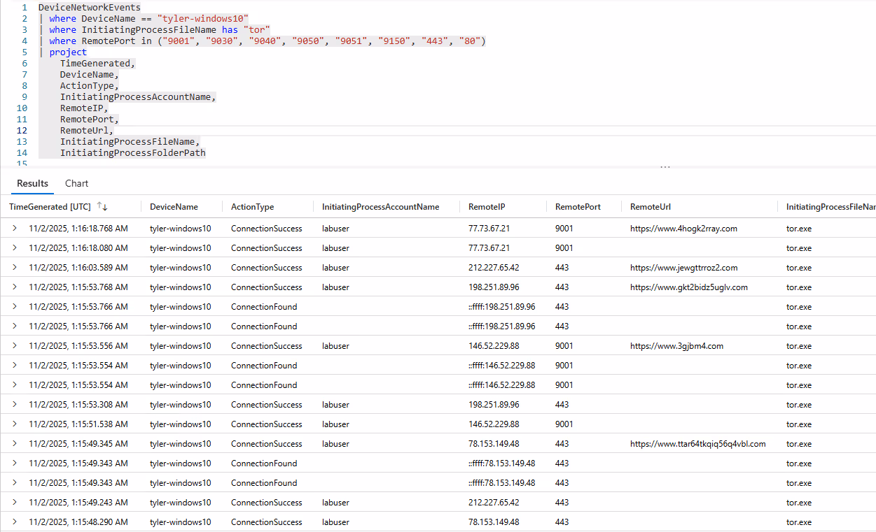 - Check "DeviceNetworkEvents" for any signs of outgoing connections over known TOR ports.