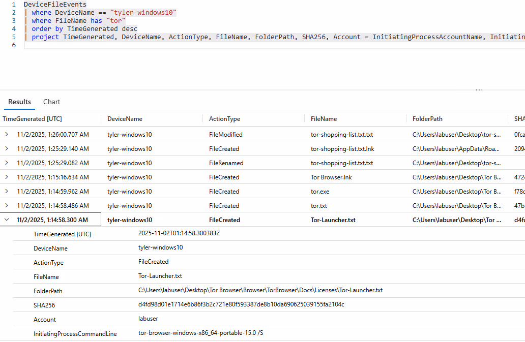 Our query results not only showed a TOR executable being downloaded, but it was renamed shortly after "tor-browser-windows-x86_64-portable-15.0.exe". These events began at: 2025-10-31T19:19:49.0331889Z.